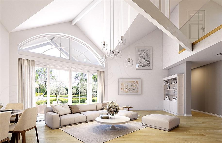 W projekcie luksusowego domu położonego na wsi położono nacisk na komfort i harmonię z naturą. Użyte materiały podkreślają klasyczny styl, tworząc elegancką przestrzeń.